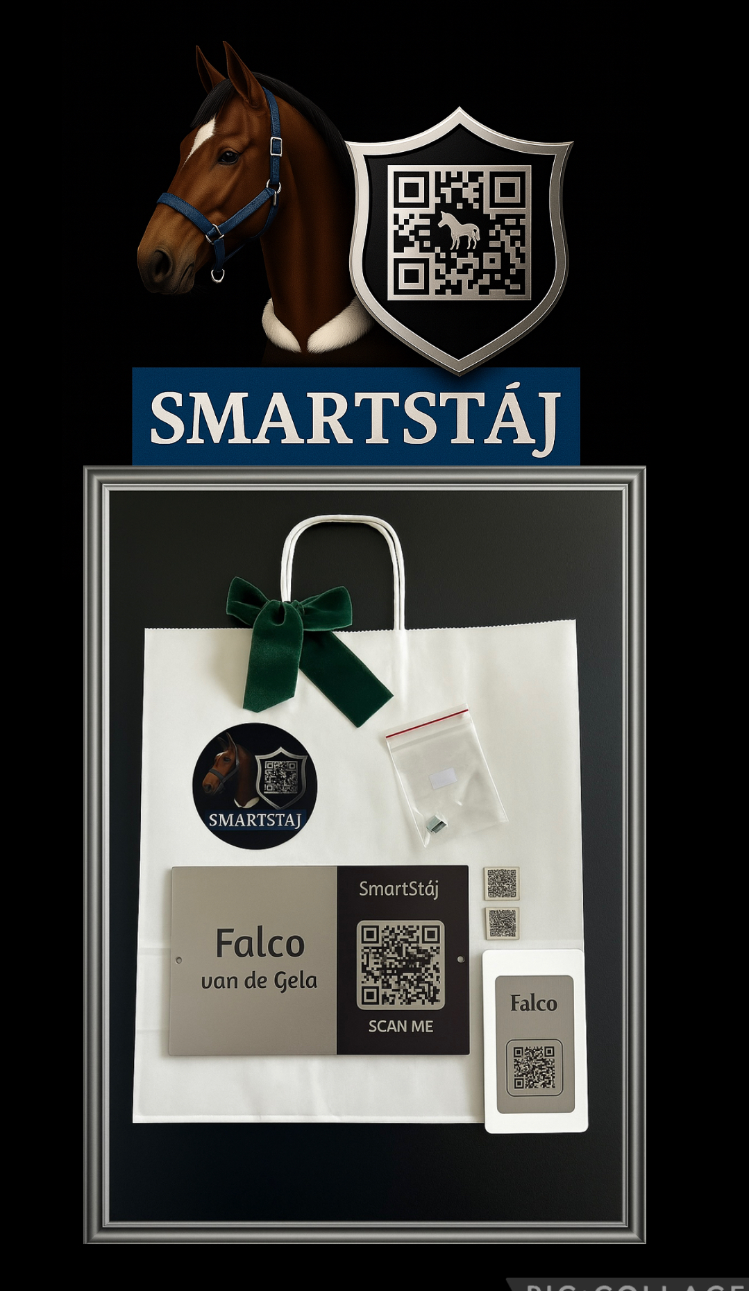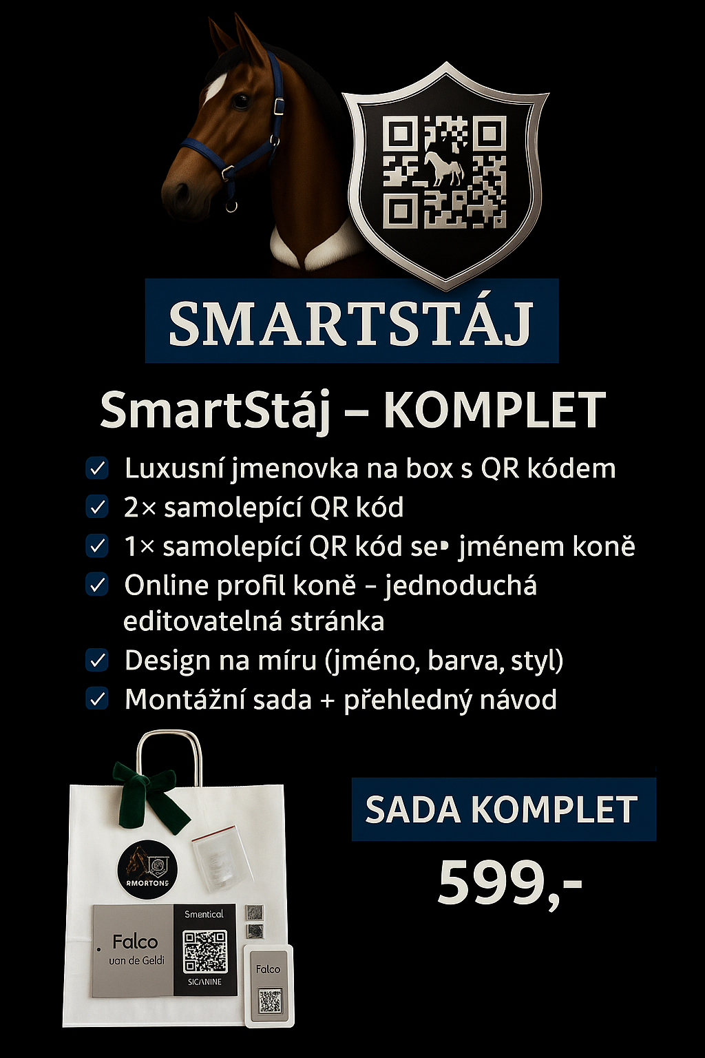 Představujeme SMARTSTÁJ – luxusní jmenovku s QR kódem, která spojuje elegantní design s maximální praktičností. Každá jmenovka obsahuje jméno koně a jedinečný QR kód, který umožňuje rychlý přístup ke všem důležitým informacím na jedno naskenování: